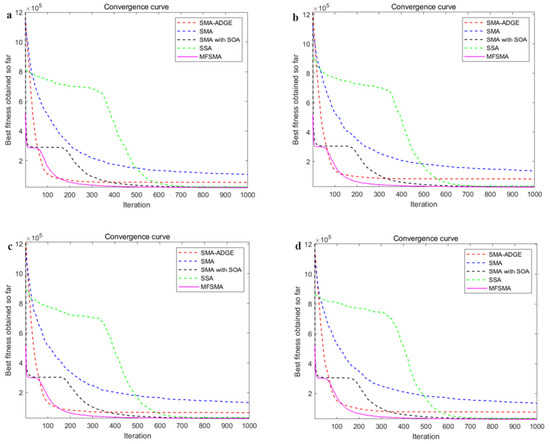 In Figure 7, we use MFSMA, SMA, SSA, SMA-ADGE, and SMA with SOA to apply the economic optimal dispatch model of the microgrid, and compare the total costs obtained by them. DG1-4 in Table 3 correspond to a-d in the figure respectively. All iterations were performed 1000 times and an average of 30 times was taken.