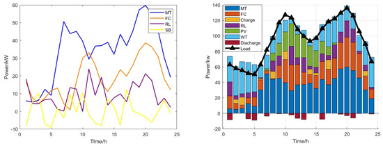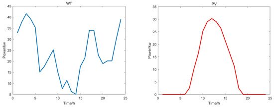 Typical 24 h loads and real-time electricity prices ($/kW·h) are given in Figure 4 [57,58]: we plotted the wind power generation power and photovoltaic power generation power for 24 h on a certain day.