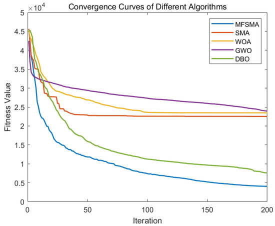 It can be seen from Figure 9 that this paper uses a variety of units and performs island operation to simulate the microgrid dispatch process. At the same time, Figure 10 shows the convergence curves of multiple algorithm comparisons. Similar to the situation of grid-connected operation, MFSMA has faster convergence speed and more accurate solutions when facing mainstream swarm intelligence algorithms and can obtain smaller costs. Compared with DBO, which is closest to MFSMA, the solution accuracy of MFSMA can be improved by 8.02–12.57% at the maximum number of iterations.
