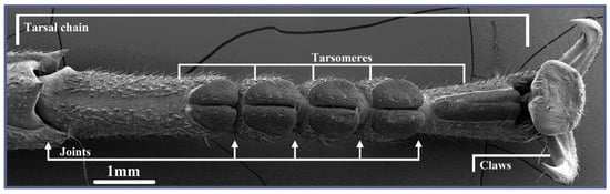 - Betz, O. Structure of the tarsi in somestenus species (Coleoptera, Staphylinidae): External morphology, ultrastructure, and tarsal secretion. J. Morphol. 2003, 255, 24–43. [Google Scholar] [CrossRef]