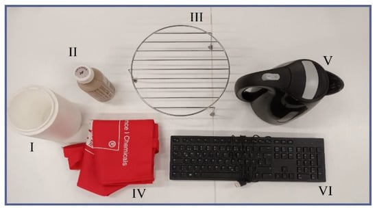 Test objects used for qualitative testing of the TriTrap gripper: I—polystyrene vase (20 g); II—empty beverage bottle made of plastic (30 g); III—steel grill attachment (160 g); IV—textile bag (40 g); V—electric water boiler (600 g); and VI—PC keyboard (400 g).