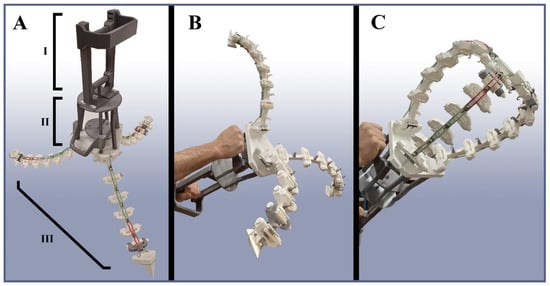 Overview of the TriTrap gripper: (A) open gripper, showcasing the handle (I), the actuation cage (II), and the arms (III); (B) gripper in hand while completely unflexed; and (C) gripper actuated to full flexion by hand.
