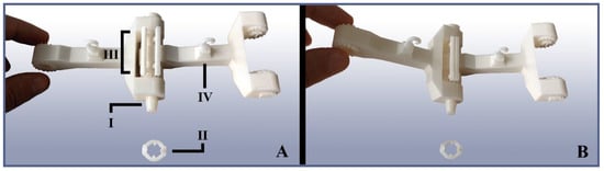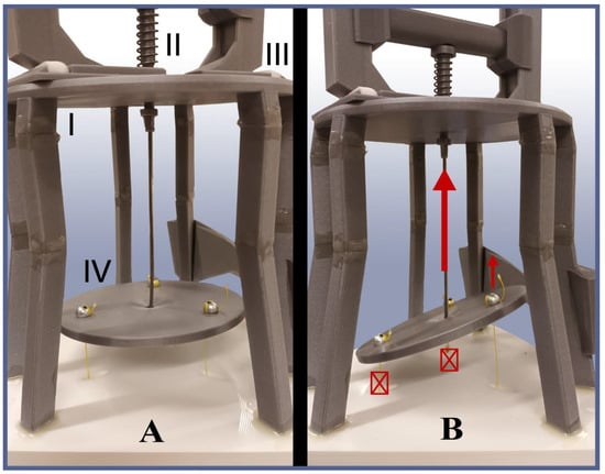 Example of the TriTrap gripper’s link–link joints. (A) Two isolated links connected by their joint, resting on its axle (I). The axle is held in place by a stopper piece (II), which, in this case, was detached for clarity. Any joint’s angular movement is limited by the angle adjusters (III), which can be modified to allow for different folding angles. Each link possesses a tendon guide (IV), which ensures the tendon’s relative position with respect to the joints. (B) The same joint in the folded state, illustrating the angle adjusters’ function.