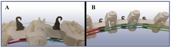 Close-up views of the arms. (A) Inner side of the arms, showing the tendon (yellow) and its guides that are necessary to keep it in its correct relative position with respect to the joints. (B) Outer side of the arms, showing the elastic relaxation (unfolding) mechanism made of standard rubber bands.