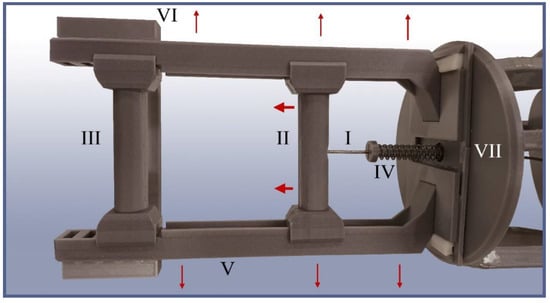 TriTrap gripper’s handle assembly. I: main actuation cord, running from the lower handle to the force-distribution disc (off to the right). II: lower handle, mounted on sliding rails to enable its movement (big arrows). III: upper handle, mounted in a fixed way as a counter grip. IV: preloader spring, used to keep a minimum strain on the system under idle conditions for handling reasons. V: sliding rails for the lower handle and overall framework for the handle assembly. VI: upper clipping lock, which keeps the sliding rails from detaching to the sides. VII: lower clipping lock, which keeps the sliding rails from detaching in the same way. If disassembly is required, the upper and lower clipping locks can be removed, and the sliding rails slide out to the sides (small arrows), granting access to the handles.