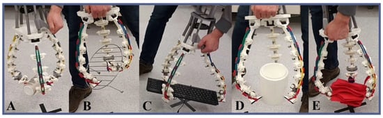Snapshots of the TriTrap gripper gripping and transporting objects: (A) plastic bottle, (B) grill attachment, (C) keyboard, (D) polystyrene vase, and (E) textile bag.