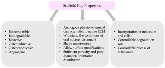 The regeneration of maxillofacial and oral osseous defects requires the development of a scaffold nanosystem that may mimic the structural, mechanical, chemical, and biological properties of the patient’s bone. Thus, scaffold’s development and design are based on critical considerations that influence the materials used, the fabrication techniques and the functionalization methods [15,24,25,30,55,75,76,77]: