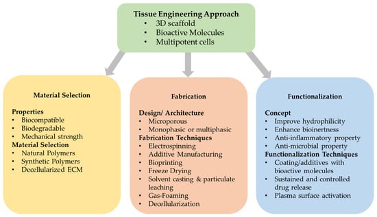 Scaffolds are the core of tissue-engineered constructs and may provide cells with the appropriate spatiotemporal guidance through their complex architecture [88]. These characteristics are dependent on a scaffold’s design, material selection, fabrication technique employed, and functionalization method. Figure 2 summarizes the various elements of this tissue engineering approach [76].