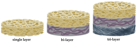 The development of multiphasic tissue-engineered constructs was necessary to achieve periodontal regeneration. These scaffolds have distinguishable compartments with different biomechanical composition and architectural nature, such as pore size/shape and porosity. These constructs can even mimic the strict hierarchical organization of periodontium. Multiphasic scaffolds are a large group of tissue-engineered constructs consisting of biphasic and triphasic scaffolds [35]. Their distinct compartment design is illustrated in Figure 4 and is compared to monophasic scaffolds. A variety of groups have developed biphasic scaffolds to achieve periodontal ligament and alveolar bone regeneration, but their attempts failed to provide a new cementum layer at the interface of the tooth. Their approach was based on the ability of endogenous cells to promote new cementum apposition, or the utilization of in vitro differentiated cells. Thus, the development of multiphasic scaffolds incorporating a third layer, which will promote cementogenesis, is necessary [35]. Triphasic scaffolds have emerged to address the issue of cementum regeneration. The three-compartment design may promote the formation of cementum on the root surface, direct the insertion of the periodontal ligament, and provide adequate rigidity [194]. Designing such a complex biomaterial may be challenging, while also the presence of low interphase cohesion resulted in a diminished mechanical stability of the system. The utilization of various novel fabrication techniques including simultaneous multiphase crosslinking and additive fabrication may address this dilemma [195,196].