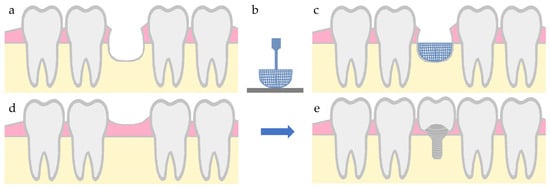 Additive manufacturing (AM), also known as 3D printing, incorporates a group of novel techniques used to fabricate three-dimensional (3D) tissue-engineering constructs that have been designed through computer-aided technologies in a layer-by-layer approach [132,133]. The bone defect is scanned with magnetic resonance imaging (MRI), or cone beam computed tomography (CBCT) and a scaffold model with volumetric shape that would fit into the defect is then designed [132,133,134,135]. The most abundantly used AM techniques in dentoalveolar settings are SLA, SLS, and FDM [46]. Selective laser sintering of ceramics, polymers and their combination, and selective laser melting (SLM) techniques have been used to form 3D constructs layer by layer. Various groups have applied these scaffolds in alveolar bone augmentation [136,137,138]. A patient-specific implant has been developed by Rasperini et al. (2015), utilizing PCL and SLS. According to the authors, limited regeneration was observed due to the polymer selected and scaffold’s design [137]. Through fused-deposition modeling, thermoplastic polymers or composite polymers can be processed with inorganic materials. The applicability of this technique has been reported in alveolar bone augmentation, periodontitis treatment, and whole tooth regeneration [127,130,137,139].