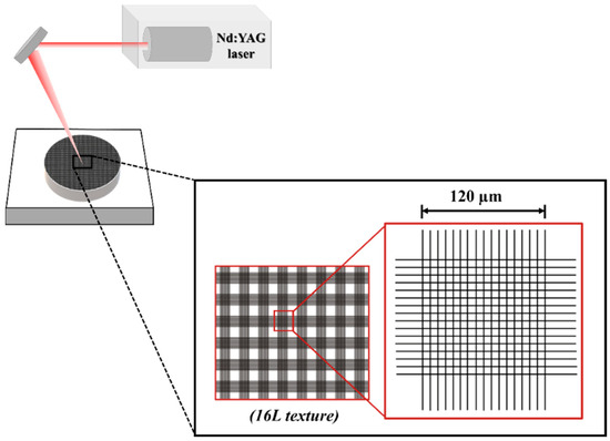 Before sintering, green test samples were laser textured using a Nd:YAG laser (OEM Plus, Sisma, Vicenza, Italy), with a focus distance of 328 mm, a 3 μm focal spot size, 6 W of output power, a pulse width of around 35 ns and a wavelength of 1064 nm. Surface texture consisted of a square crosslinked pattern with 16 lines in each direction over the surface (Figure 1). The texturing was performed in normal air and atmospheric pressure using the following laser parameters: power of 40% (2.4 W), a scan speed of 128 mm/s and three laser passages, based on previous works [26,27,28].