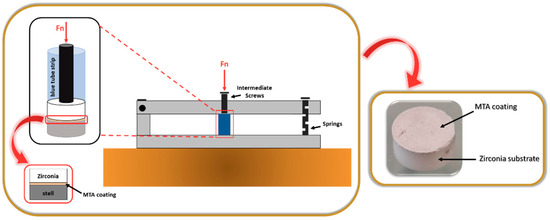 The samples were placed inside small blue tube sections (obtained from PCR tube strips), and a punch was positioned on the uncoated side of the zirconia substrate (textured surface). The strips were then placed under the intermediate screws of the developed device, and pressure was applied for 3–4 h, through the pressure of the plates. After this time, the pressure was released and the MTA-coated zirconia structured samples were kept inside the tubes for 24 h to ensure effective setting of the coating. Finally, the samples were removed and subjected to a highly energetic and aggressive ultrasonic adhesion test for 1 min.