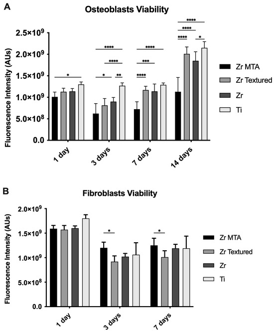 Bar charts showing osteoblast (A) and fibroblast (B) viability measured on Zr MTA, Zr textured, Zr and Ti as mean exhibited in arbitrary units (AU) of fluorescence intensity. The standard deviation (SD) is represented by error bars. Statistical significance: * p < 0.05, ** p < 0.01, *** p < 0.0005, **** p < 0.0001; n = 15.