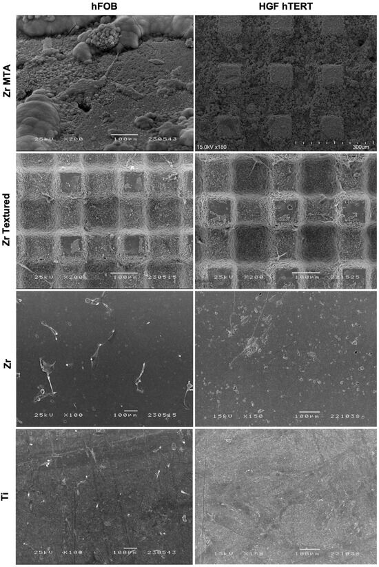 SEM images (Figure 4) obtained on samples after 1 day of osteoblast and fibroblast cultures are presented with their respective magnifications. Images show adherent cells in all samples after 1 day of culture in both osteoblast and fibroblast cultures. However, Zr MTA samples appear to have fewer osteoblasts compared with the other surfaces, unlike fibroblast cell bodies, which appear to have homogeneously adhered to all of the samples. Concerning cell morphology, the images show that osteoblast culture in Zr and Ti samples presented an elongated shape with some projecting processes, while in Zr MTA and Zr textured a more prismatic cell conformation was observed in the osteoblasts. Fibroblasts presented a typical elongated veil shape and filopodia formation, with more evident cell bodies in the Zr MTA and Zr textured samples.