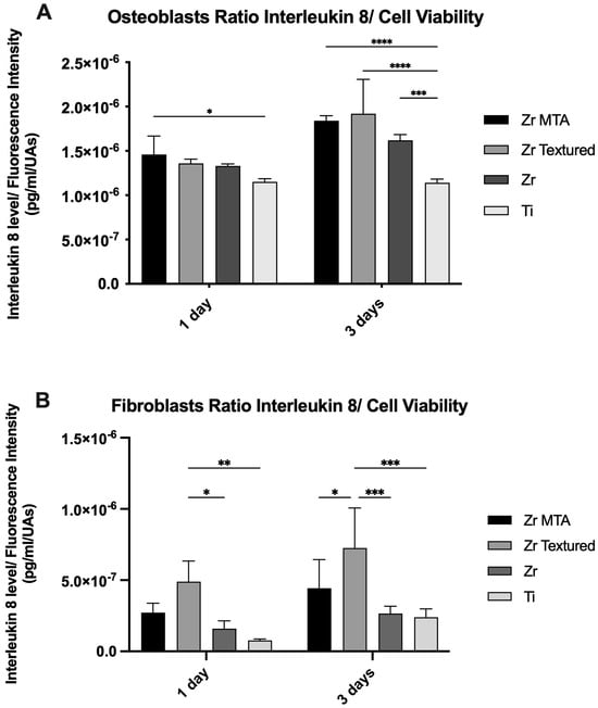 IL-8 secretion by osteoblasts and fibroblasts was obtained at 1 and 3 days and is presented in Figure 5 as an IL-8 concentration/cell viability ratio. The results reveal that the Zr MTA group showed higher IL-8 secretion by osteoblasts compared with the Ti group (p < 0.05) at 1 day. At 3 days, the Ti group revealed significantly lower values compared with the Zr MTA (p < 0.001), Zr textured (p < 0.001) and Zr (p < 0.005) groups. Concerning fibroblast IL-8 secretion, the Zr textured group showed significantly higher values compared with Zr (p < 0.05) and Ti (p < 0.001) at 1 day and compared with all groups at 3 days of culture.