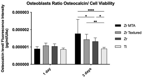 Osteocalcin results are also presented as osteocalcin concentration per cell viability (Figure 6). The results show an increased production of osteocalcin from day 1 to 3 in all groups. Although no significant differences between groups were found at 1 day of culture, higher levels of osteocalcin were found in the Zr MTA group compared with the Zr (p < 0.05) and Ti (p < 0.001) groups at 3 days.