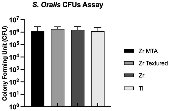 The CFUs per milliliter of Streptococcus oralis on the discs were evaluated at 24 h of culture, as shown in Figure 7. All samples showed CFU values of around 106, and no statistically significant differences were observed between groups.