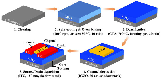 Fabrication flow diagram of organic–inorganic hybrid MSQ-based EDL synaptic transistors.