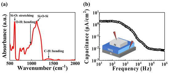 (a) FT-IR spectra of the organic–inorganic hybrid MSQ-based EDL synaptic transistor. (b) Frequency-dependent capacitance curve of Al/MSQ/Pt capacitors.