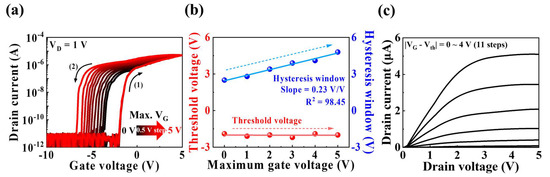 (a) Double-sweep transfer curves as a function of maximum gate voltage (VG = 0–5 V in steps of 0.5 V) at constant VD = 1 V. (b) Hysteresis window and threshold voltage with increase in maximum VG. (c) Output versus the difference in gate voltage and threshold voltage (|VG − Vth| = 0–4 V in steps of 0.4 V).