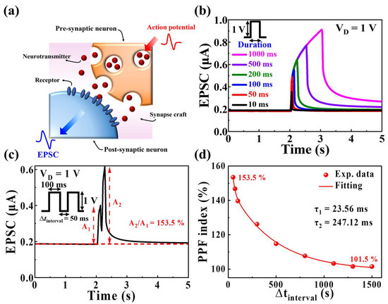 In the field of neuroscience, PPF is observed across various brain regions and neurotransmitter systems, representing a fundamental aspect of dynamic information processing and neuron communication [40,41]. PPF occurs when two consecutive stimuli are applied, resulting in the facilitation of the response to the second stimulus compared with the first. Figure 4c illustrates the EPSC triggered through the application of two identical pre-synaptic pulses (amplitude = 1 V; duration = 100 ms; ∆tinterval = 50 ms). The EPSC (A2) amplitude of the second spike was larger than the EPSC (A1) amplitude of the first spike. This behavior was attributable to the short interval between the first and second spikes, which caused the mobile protons in the MSQ to re-excite before complete relaxation following the first spike. Therefore, a narrow time interval (∆tinterval) between spikes contributed to increased channel current, as the incomplete relaxation of the proton after the first spike led to proton generation by the second spike. The amplification ratio between the EPSCs following the first and second spikes was quantified using the PPF index. The PPF index was determined using the following double-exponential decay function: [42]