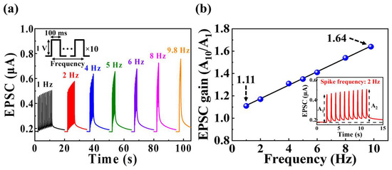 Dynamic signal filtering based on frequency is facilitated by short-term synaptic plasticity. Short-term synaptic plasticity, primarily exhibited as short-term depression and facilitation, allows for variation in the response pattern of a neuron to repetitive stimuli, enabling signal pass filtering [43,44]. Therefore, the behavior of short-term synaptic plasticity, encompassing both depression and facilitation, contributes to low- and high-pass filtering functions [44]. Figure 5a illustrates the EPSC responses induced by 10 sequential pre-synaptic pulses (amplitude = 1 V; duration = 100 ms) with frequencies varying from 1 to 10 Hz. The EPSC values for each spike induced at a frequency of 1 Hz remained nearly constant, with minimal deviation from the first triggered EPSC value of ~0.45 µA. However, as the frequency increased, the tenth triggered EPSC increased. Figure 5b presents the frequency-dependent EPSC gain of pre-synaptic spikes, calculated as the ratio of the first EPSC gain (A1) to the tenth EPSC gain (A10). As the frequency increased from 1 Hz to 10 Hz, the EPSC gain increased from 1.11% to 1.64%. Thus, the proposed MSQ-based EDL synaptic transistor could successfully demonstrate high-pass filtering functionalities.