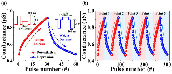 (a) Potentiation and depression characteristics of synaptic weights induced by pre-synapse pulses. (b) Endurance over five cycles of potentiation and depression.