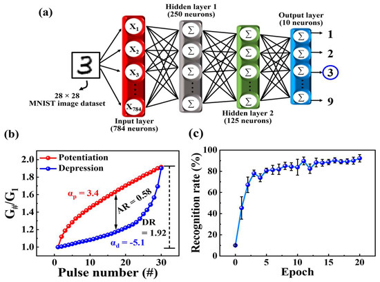 where Gmax and Gmin represent the maximum and minimum conductance, respectively; and ω is an internal variable ranging from 0 to 1. α represents the nonlinearity factor controlling potentiation and depression, with an ideal value of 1. The nonlinearity factors (αp and αd) for potentiation and depression in the fabricated transistor were 3.4 and −5.1, respectively. Using the normalized conductance and extracted parameters, we designed the interlayer synaptic weights in the DNN model. The DNN was then trained over a dataset involving 60,000 MNIST images, and recognition simulation tests were performed using 10,000 handwritten images after each epoch of the training dataset. Figure 8c illustrates the recognition accuracy during training epochs, ranging from 0 to 20 cycles, with each node in the hidden layer set at constant values of 250 and 125. The recognition rate at epoch 0, representing the untrained state of the DNN model, was 10.1%, which increased to 92.28% as the number of epochs increased. These recognition simulation results demonstrated that the MSQ-based EDL synaptic transistor could successfully emulate human brain learning and memory processes.