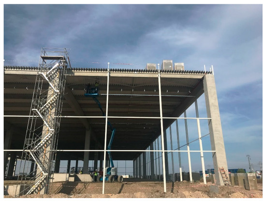 Load-bearing structure for a single-story warehouse on a site with severe seismic action, ground acceleration ag = 0.35 g. Reproduced with permission from ©SDC Project [https://www.sdcproiect.ro/wp-content/uploads/2018/10/IMG_1887-08-06-18-11-30-1.jpg (accessed on 4 March 2024)].