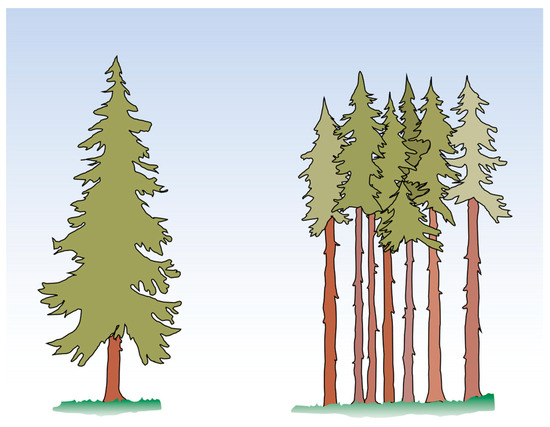 Coniferous forest trees (spruce species) as freestanding (left) versus densely growing (right). Adapted from ©Swedishwood [https://www.swedishwood.com/optimized/default/siteassets/1-trafakta/2-att-valja-tra/01/com/fristaende-gran-com.jpg/ (accessed on 4 March 2024)].