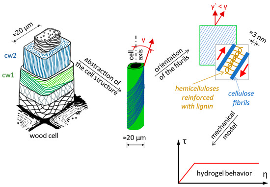 Cell wall structure in coniferous wood, representing the main cell walls cw1 and cw2, respectively, the middle lamella between the cells (left side), data from [68]. Geometry of cellulose microfibrils in the cell wall of coniferous wood and the angle made by the microfibrils with the longitudinal axis of the cells, γ, which decreases with increasing axial stress along the cell walls (in the center), data from [66,69,70]. The mechanical response of the cellulose fibrils embedded in the hemicellulose and lignin matrix, represented as a characteristic curve τ-η (shear stress–strain) (right corner), data from [66,69,71].