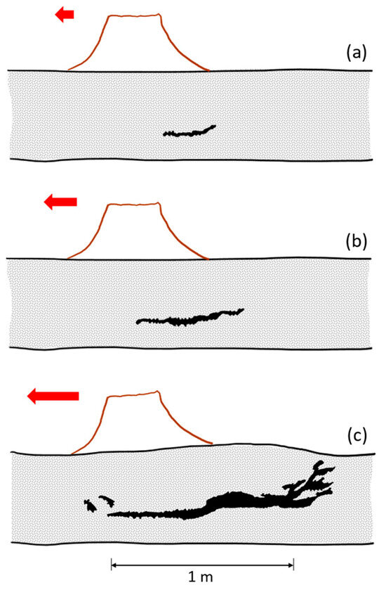 Sequences in root–soil system failure when a tree is pulled with an increasing horizontal force (red arrows). (a) Formation of crack close to stem base on windward side, (b) cracks extending windward and leeward, (c) appearance of cracks for the maximum uprooting turning moment, adapted from [73].