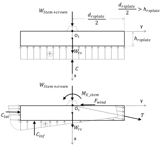 Distribution of reaction forces at the base of the foundation under the assumption of a centric compression (a compression with high eccentricity), a Grudnicki concept, adapted from [9]. The root–soil plate is considered to have an average diameter of drsplate and a depth of hrsplate.
