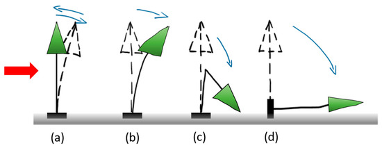 Shapes of tree deformability and instability due to wind action (the direction of wind is represented using the red arrow). (a) Bending and elastic buckling of the trunk, in which case the trunk returns to its original vertical position, (b) bending and plastic buckling of the trunk, in which case the stem remains deformed, (c) breakage of the trunk, and (d) overturning the tree by uprooting. Adapted from [7].