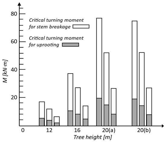 Figure 11 shows values of resistance to overturning by uprooting and by breakage of the trunk for several Scots pine trees [86]. Analyzing the results, one can see that all trees loaded with self-weight and a lateral force failed by overturning with uprooting, the trunk bending resistance being almost four times higher than the uprooting resistance. The following data are considered in the calculations: modulus of elasticity 7000 MPa, flexural (bending) strength of the stem 32 MPa (=70% of breaking stress), fresh density of soil 1700 kg/m3, tree species Scots pine [86].