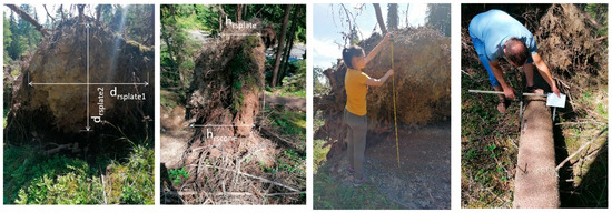 The forest was affected by strong winds, with many trees being uprooted, broken, or left leaning (Figures S1–S30). From these, we selected 30 specimens of uprooted trees, ensuring that they had close values for diameter, height, and crown size. We measured the diameter of the trunk, the length of the stem, and the dimensions of the root system (thickness, diameters, depth, (Figure 13 and Table 2)).