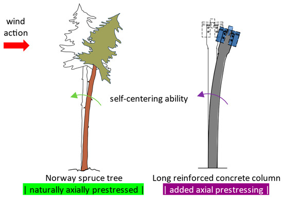 This article contains the results of identifying the potential of coniferous trees to act as bioinspiration for the structural design of columns in single-story warehouses subjected to high wind velocity and severe seismic action. This study starts by analyzing the biomechanics of coniferous trees, continues with an abstraction of the relevant features, and ends with the transfer of a design methodology for long reinforced and prestressed concrete columns. To verify the applicability and validity of the mathematical relationships extracted from the bibliographic study to characterize the biomechanics of coniferous trees, a study site is conducted for Norway spruce trees felled by the wind in the Bilbor area. The design methodology for long reinforced and prestressed concrete columns bioinspired by the Norway spruce trees is experimentally validated using two case studies. The first case study deals with the effect of centric prestressing on long concrete columns, and the second on the influence of the walnut shell powder on the adhesion of the reinforcement in concrete. The case studies presented aim to transfer some characteristics from trees to reinforced concrete to improve the performance of long columns under horizontal forces. The results obtained indicate a good approximation of the trees’ structural behavior for this site and for ones investigated by other researchers in different forests.