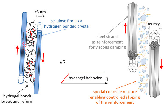 Mechanochemical model for the deformation of hemicellulose in cell walls of coniferous wood. At the contact between hemicellulose and cellulose fibrils, a hydrogel-type matrix is formed, and it is assumed that, when the fibrils are subjected to axial stress at the fibril–matrix interface above a certain limit value of the unit shear stress (τ), the matrix shears and flows by opening and reforming hydrogen bonds. The mechanical response of the hemicellulose and lignin matrix is represented as a characteristic curve τ-η (shear stress–strain, Figure 5) [66,69,71].