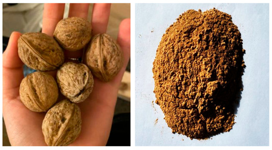 - Jahanban-Esfahlan, A.; Ostadrahimi, A.; Tabibiazar, M.; Amarowicz, R. A comprehensive review on the chemical constituents and functional uses of walnut (Juglans spp.) husk. Int. J. Mol. Sci. 2019, 20, 3920. [Google Scholar] [CrossRef] [PubMed]