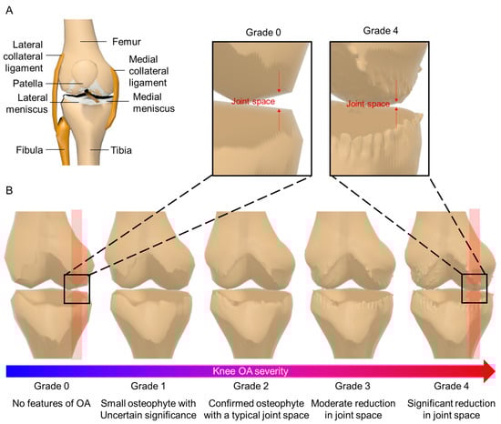 The knee bone consists of the femur, tibia, and fibula (Figure 1A). As osteoarthritis (OA) progresses, osteoclasts form and bony protrusions develop (Figure 1B). Cartilage wears out, and the joint space narrows. OA severity is classified into levels 1 to 4 using the Kellgren–Lawrence (KL) grade scale based on radiographic findings and symptom progression [5,6,7]. Here, level 0 means normal knee. Symptoms, x-rays, and MRI images are used to define OA levels. Grade 1 shows a slight bone gap, suggesting possible OA. Grade 2 presents a clear bone gap, but the gap between the knee joints is not significantly narrowed. In Grade 3, the gap starts to narrow. Finally, Grade 4 exhibits a significantly reduced gap and visible bone spurs (Figure 1B).