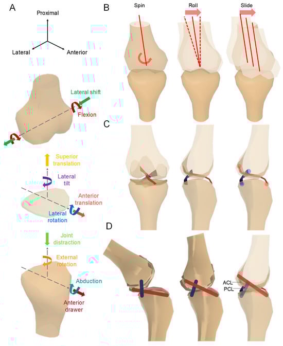 (A) Shows the axis of the knee joint. (B) Shows the spin, roll, and slide movements of the tibia (femur); (C,D) show the knee movement of the four-bar-link.