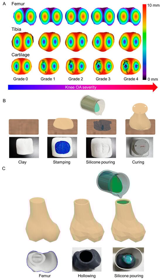 (A) 3D model of bone used in the study. Femur, tibia, and cartilage in a row according to the OA level. (B) The cartilage production method. (C) Shows the manufacturing steps of a 3D-printed exoskeleton with polymer filling inside.