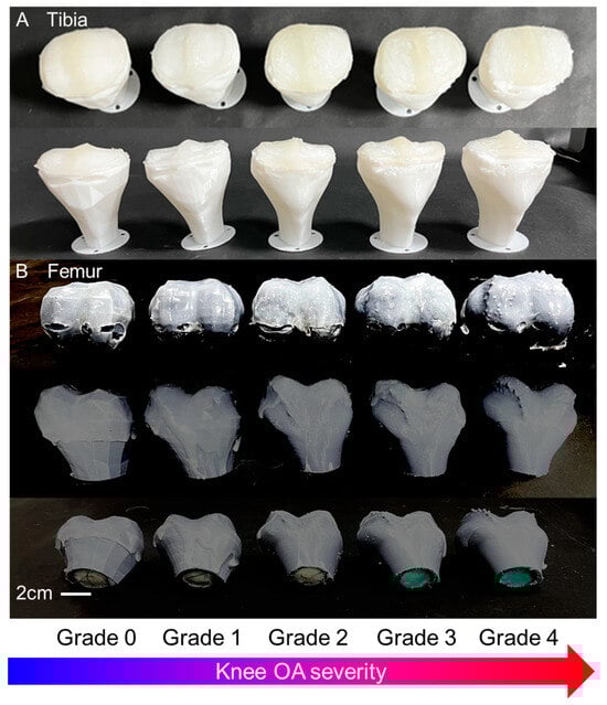 3D model of the knee bone is shown in Figure 3A. Figure 3A demonstrates a correlation between increasing OA levels and the erosion of femur and tibia bones, accompanied by a reduction in cartilage thickness and an increase in its roughness. The color bar on the y-axis indicates depth, with the maximum depth set at 10 mm. By examining the height variations in each bone, it becomes apparent that as the severity of the disease increases, there is significant flexion and a corresponding increase in the amount of cartilage that is removed. As the level increases, the thickness of the cartilage becomes thinner and uneven. The specific design of the knee bone model was redrawn through 3D modeling programs after converting patient CT data into 3D models using the InVesalius program. Based on this, it was printed in an FDM method using Polyactic acid (PLA) filaments through a 3D printer, followed by a detailed fabrication method. PLA and human knee components’ material properties are compared in Table 1.