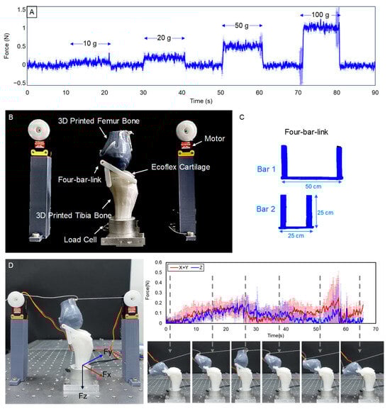 To evaluate the characteristics of knee movement using the artificial model, the cartilage-mounted artificial tibia is secured with a force measurement sensor, and the tibia and femur are connected by a link. The rated capacity of the force measurement sensor used in this experiment is force 100 N, torque 2.5 N·m, and the resolution is force 0.2 N, torque 0.0008 N·m. In addition, before measuring the force applied to the knee, an accuracy evaluation experiment was conducted. This experiment was conducted by raising and lowering the weights of 10 g, 20 g, 50 g, and 100 g every 10 s. As a result, a slight error occurred, but it was confirmed that the weight was well reflected in the value (Figure 5A). The experimental setup is shown in Figure 5B,C shows the fabricated four-bar-link. Force was measured according to the joint movement of the cartilage attached model. The force measurement sensor under the tibia captures the forces exerted through the tibia during motions. This could include walking, running, or other activities that mimic real-life scenarios. The sensor measures forces in two dimensions which are axial and anterior. A thread was connected to the upper fixture of the artificial bone femur and pulled by a motor to cause a knee bending motion. At this time, the motor for adjusting the femur was aligned with the end of the knee bone femur. While using the thread, tension force was included when the motor location was lower than the femur. It could be solved using the motor in the same position as the end of the femur. The amount of force change in the x, y, and z axes was measured using a force measurement sensor fixed to the lower end of the tibia. The same experiment was conducted on the normal model and OA Levels 1–4. Figure 5D represents the force measurements of the load cell in relation to the direction of force during normal movement of the knee bone.
