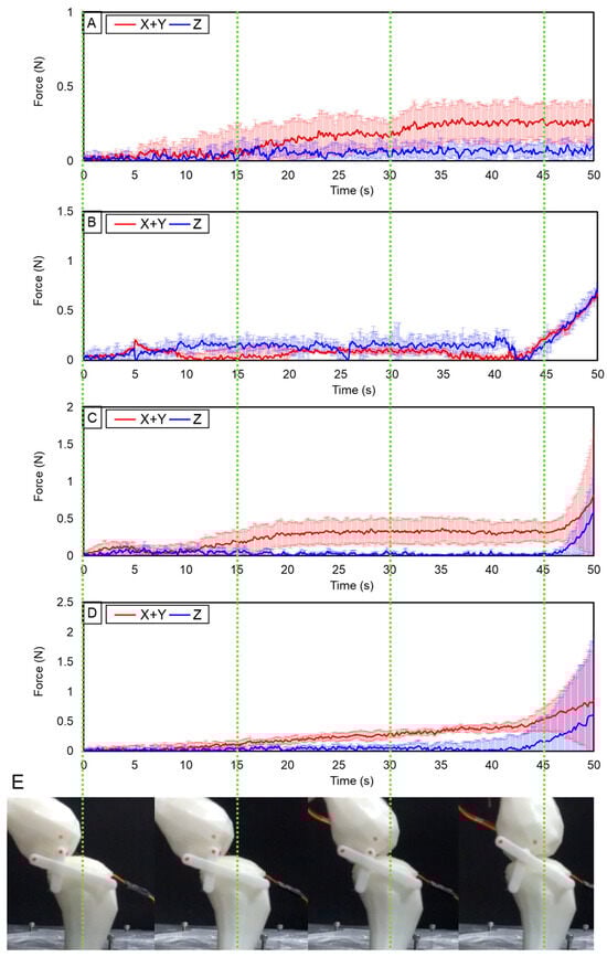 (A) Result of measuring the force with a load cell for Level 1, (B) Level 2, (C) Level 3, and (D) Level 4 knee bone. (E) Captured movement at 0 s, 15 s, 30 s, and 45 s.