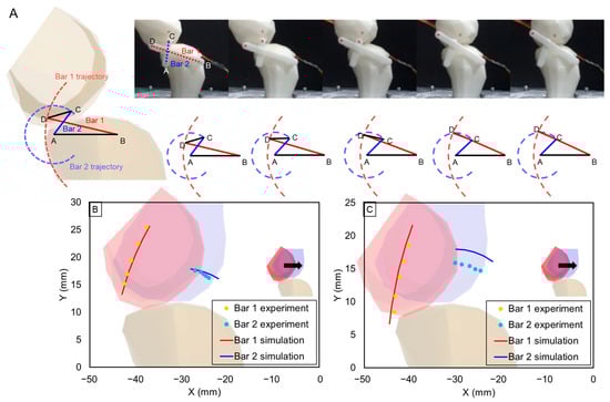 The four-bar-link mechanism is one of the general mechanisms used to simplify and imitate knee joint movement. The system is characterized by its simplicity and efficiency, which is achieved by a limited number of links and an intuitive joint construction. However, the straightforward link construction might restrict the ability to produce a wide range of turning radii. In the four-bar-link theory, two bars draw a circle based on each midpoint. Figure 7A shows the theoretical four-bar-link movements that occur according to knee joint rotation in chronological order. Figure 7B,C shows the theoretical trajectory derived from the linkages of the four-bar-link and the experimental trajectory of the endpoint of the fabricated link. Figure 7B represents the normal model, while Figure 7C depicts the outcome of implementing the skeletal model of OA level 4. The similarity between the simulated and experimental values of bar 1 was confirmed in both the normal model and the OA level 4 model. However, in the case of bar 2, there was a discrepancy between the theoretical and experimental values in the patient model. Furthermore, in the case of the patient model, it was verified that the trajectory slope of bar1 exhibited a pronounced steepness. In the graph, link 1 indicates an average movement of 38 degrees, whereas link 2 indicates an average movement of 40 degrees.