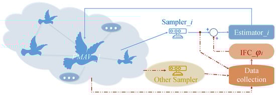 To ensure that the system maintains excellent estimation performance despite an unstable communication environment, this paper introduces a novel estimator model with an embedded information fusion correction function. This function enhances estimation accuracy by incorporating an information feedback link. Specifically, the traditional signal sampling and estimation link, depicted as the light blue solid line in the upper half of Figure 1, is complemented by the addition of the orange dotted line in the lower right, as illustrated in Figure 1. This addition aims to enhance the utilization rate of multi-node information transmission. The signals sampled by each sampler are consolidated at the data aggregation center and transmitted to the corresponding estimator. Subsequently, all information is fused and calculated by the constructed information fusion correction function φ i ( t ) . The results are then transmitted to each FMAV, where they are used to correct the estimator and refine parameter values. This process enhances the accuracy of the information obtained by the estimator and reduces the conservatism of the estimation error system.