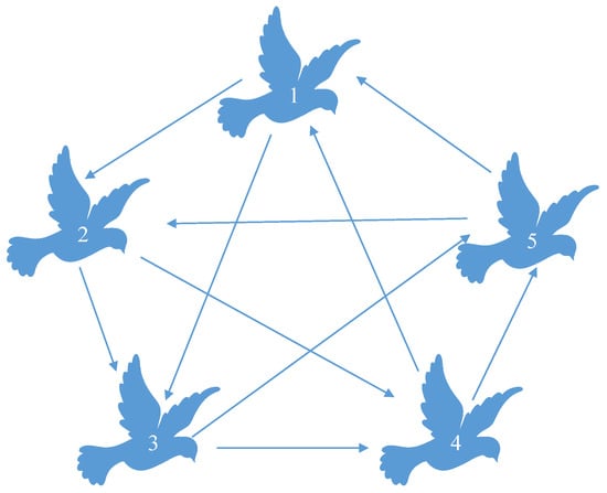 In this paper, five FMAVs are simulated to analyze the system’s state. Each FMAV employs distributed communication within the system, and the communication topology between them is depicted in Figure 2. To streamline the simulation calculation, the simulation focuses solely on the X O Y transverse plane of mass movement. The system matrix of the model is as follows: