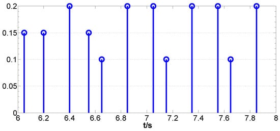 The upper bounds of the sampling time for each FMAV are taken as τ 1 = 0.15 , τ 2 = 0.18 , τ 3 = 0.17 , τ 4 = 0.20 , τ 5 = 0.18 , where the non-uniform sampling interval is shown in Figure 3. Respectively, we then have τ ¯ = 0.20 . According to Theorem 1, the following distributed state estimation parameters can be obtained: