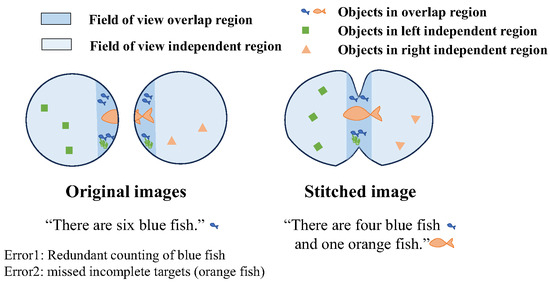 The fish-like vision system is suitable for underwater applications of bionic robotic fish: not only does it conform to the streamlined shape of the fish, but it also significantly increases the range of the perceptual field of view. However, when applied to higher-level algorithms such as target recognition, separately processing the left and right eye images may result in errors, such as incomplete detection of targets or redundant counting of targets in binocular overlap regions, as shown in Figure 4.